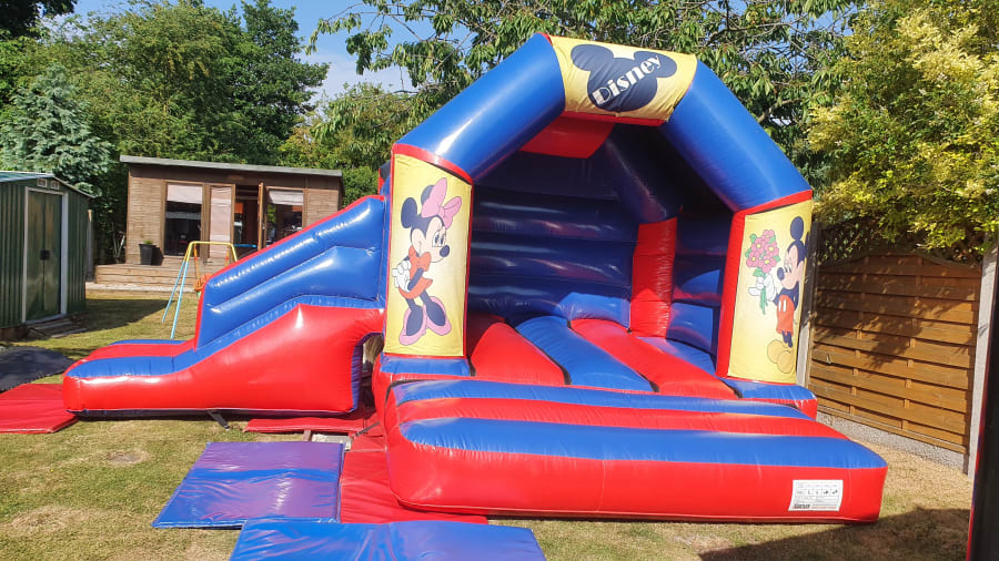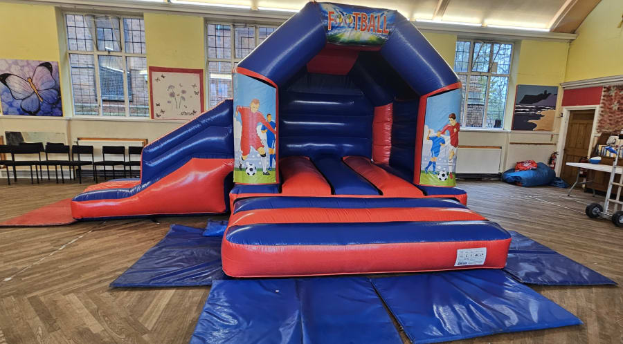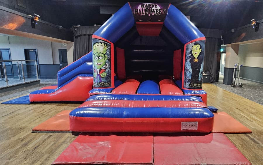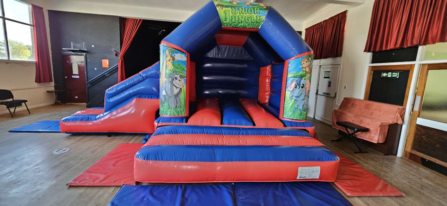 This inflatable has a good size bouncing area and a 6ft long slide on the side, its overall size is 18ft wide and 15ft deep from back to front, it stands at just over 10ft tall so fits in lots of village halls.
