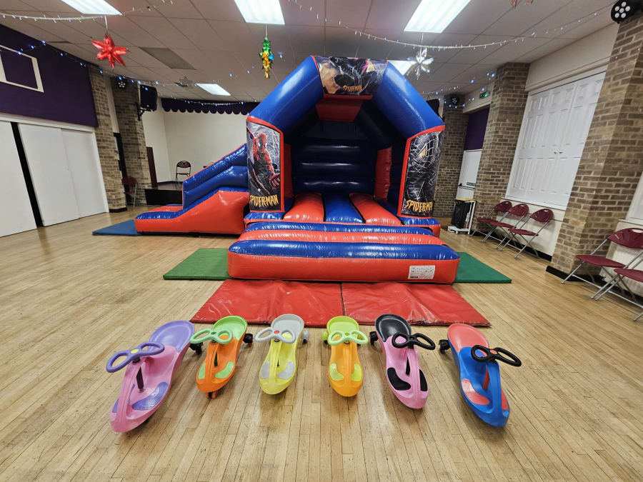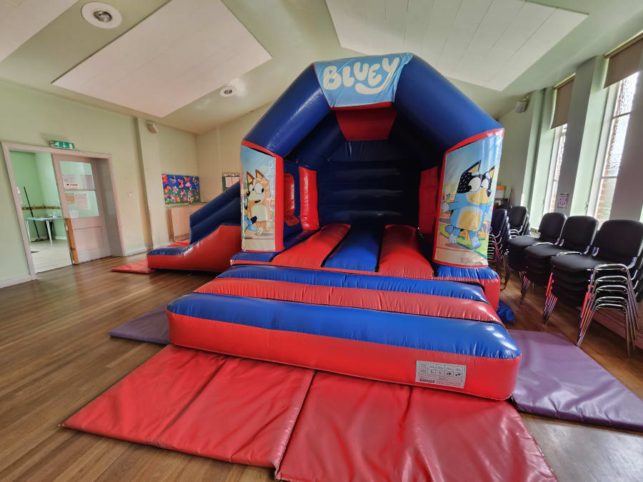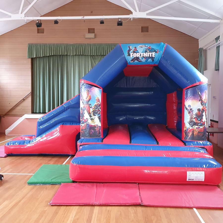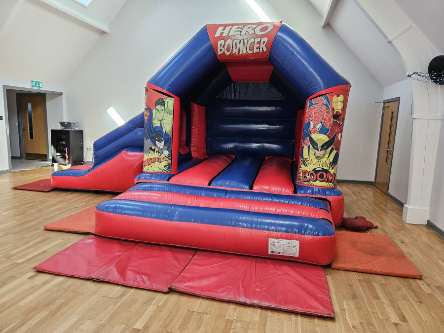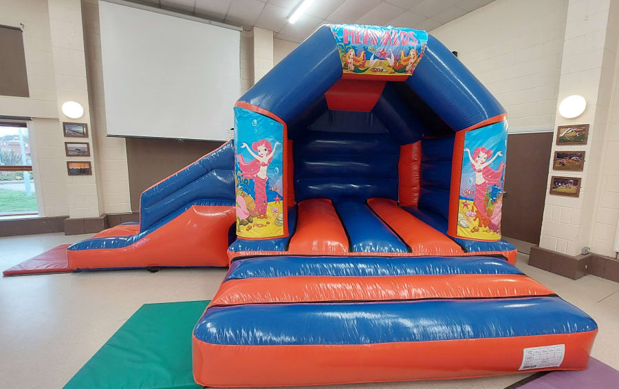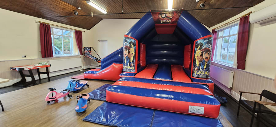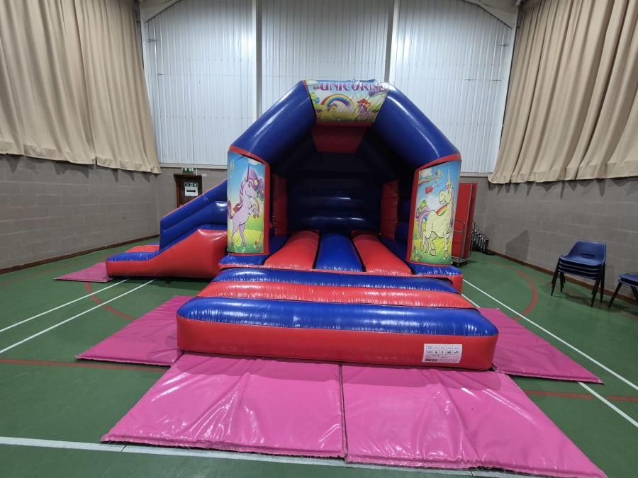 This inflatable has a good size bouncing area and a 6ft long slide on the side, its overall size is 18ft wide and 15ft deep from back to front, it stands at just over 10ft tall so fits in lots of village halls.