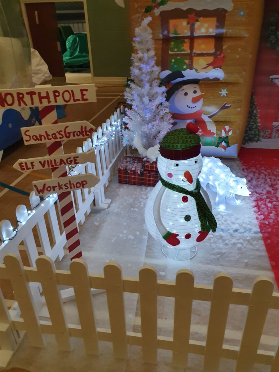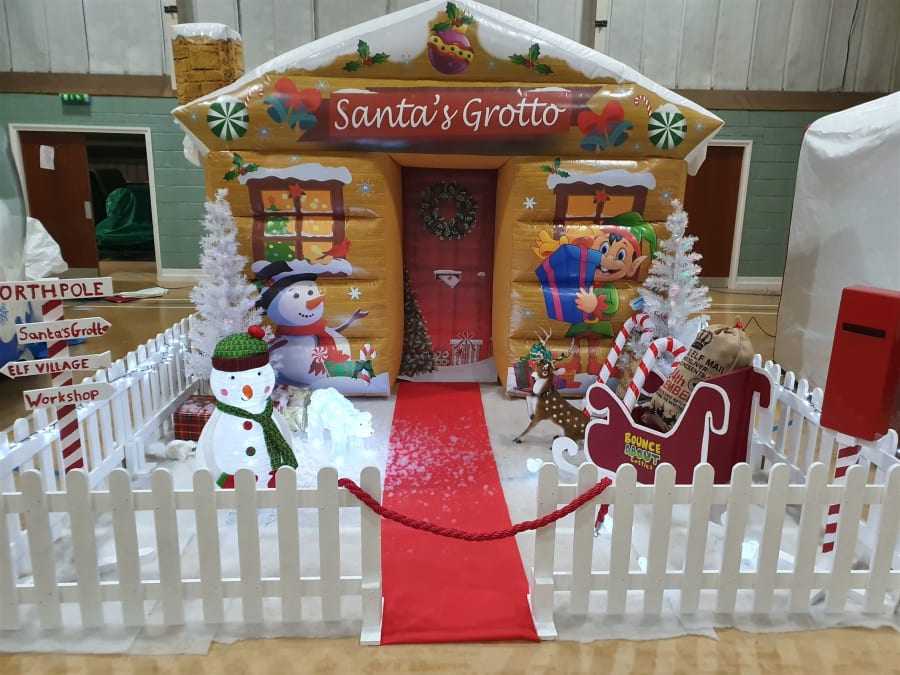 The garden area includes a post box, Sleigh loaded with present sack and reindeer, light up polar bear and 5 light up doves, light up snowman, north pole/grotto sign, 2 x fibre optic trees surrounded by presents. Red carpet, entrance rope, and lastly for added wow factor a remote control snow machine which the kids absolutely love. Please note you will need to ask SANTA to attend, he is not included with the Grotto.