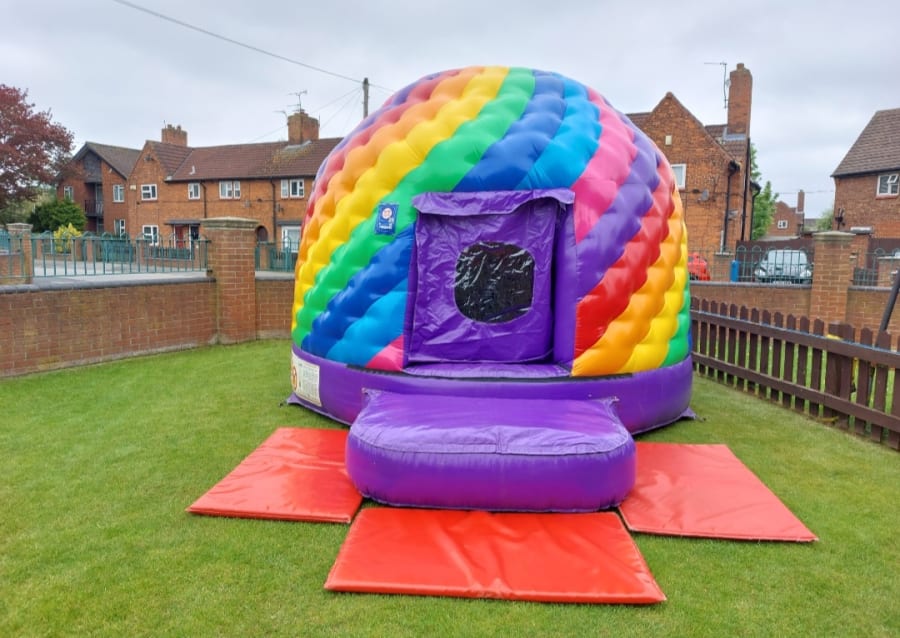 The Candy Twist Disco Dome features a flashing disco light inside at the top and an upgraded speaker system at the back which can be connected via Bluetooth, many customers then use spotify or youtube to play their favourite music. In our design specifications for this castle when ordered we requested a door for the entrance, this allows for the door to be rolled down or rolled up and fixed at the top of the entrance.