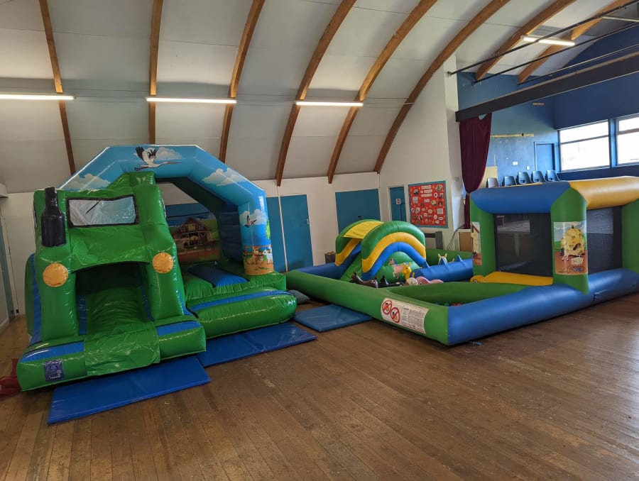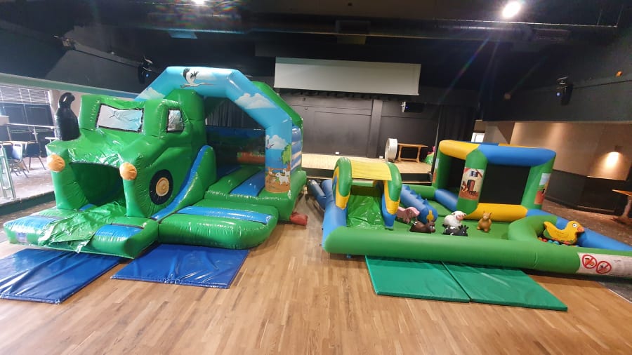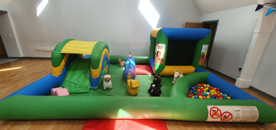 The farmyard fun is one inflatable arena themed like a farmyard, it has a small bouncy castle, ball pool and slide inside as well as matching farm animal soft play and space hoppers too. Measuring 13ft x 16ft
