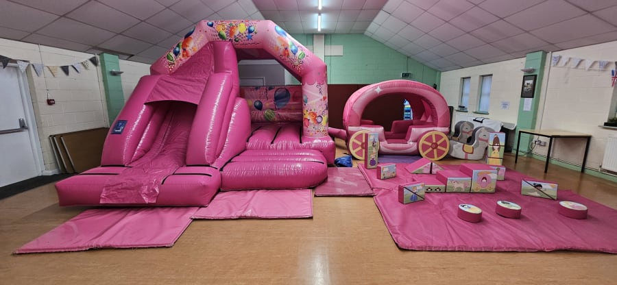 Featuring a hugely popular Princess Bouncy Castle with a slide. An inflatable Carriage shaped Ball Pool and a Princess 17 piece soft play set on a 10ft x 10ft Pink mate.