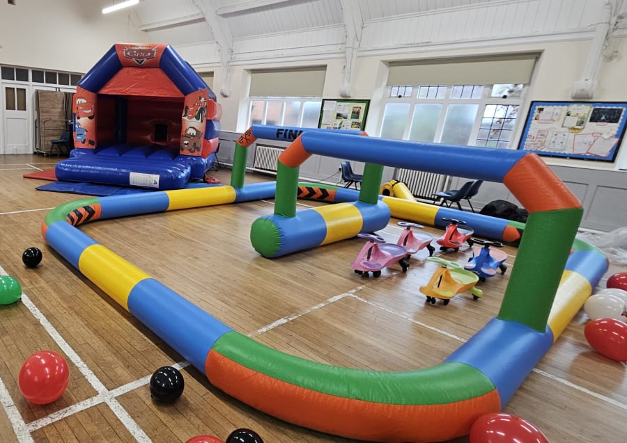 Cars Package 2 features a Cars themed 11ft x 15ft Bouncy Castle (Choice of colours 4) and our hugely popular wiggle car track with 5 Ride on Wiggle Cars. Over the winter months in village halls that is our best selling party package, we always receive comments on how much fun the ride on wiggle cars provide.